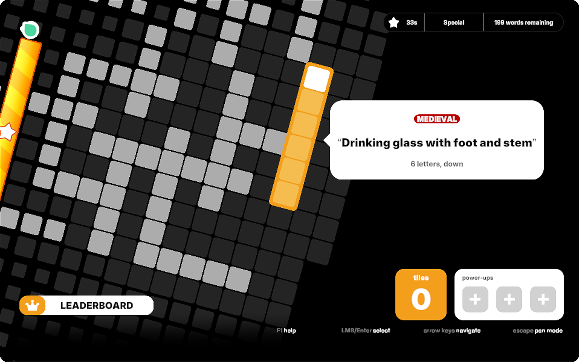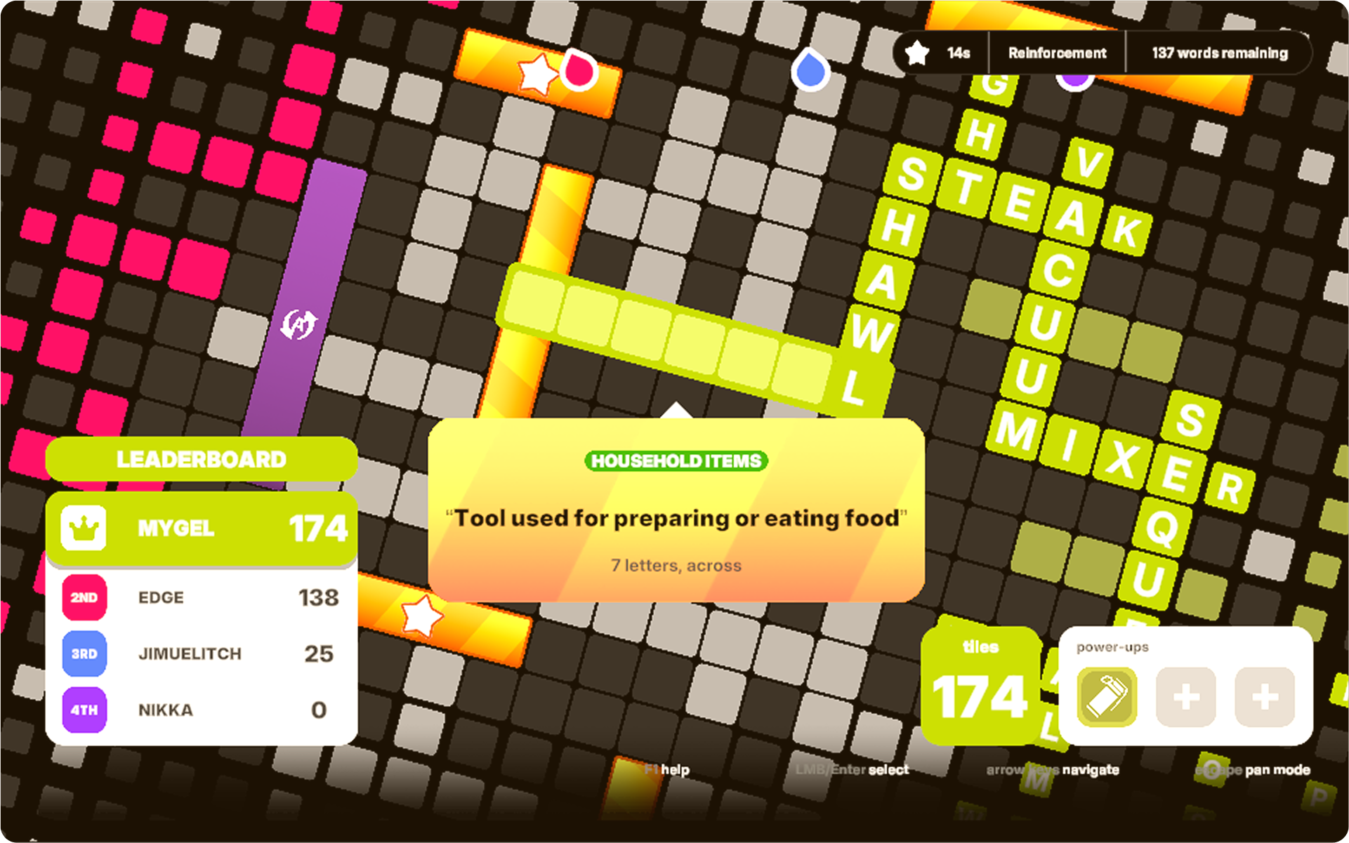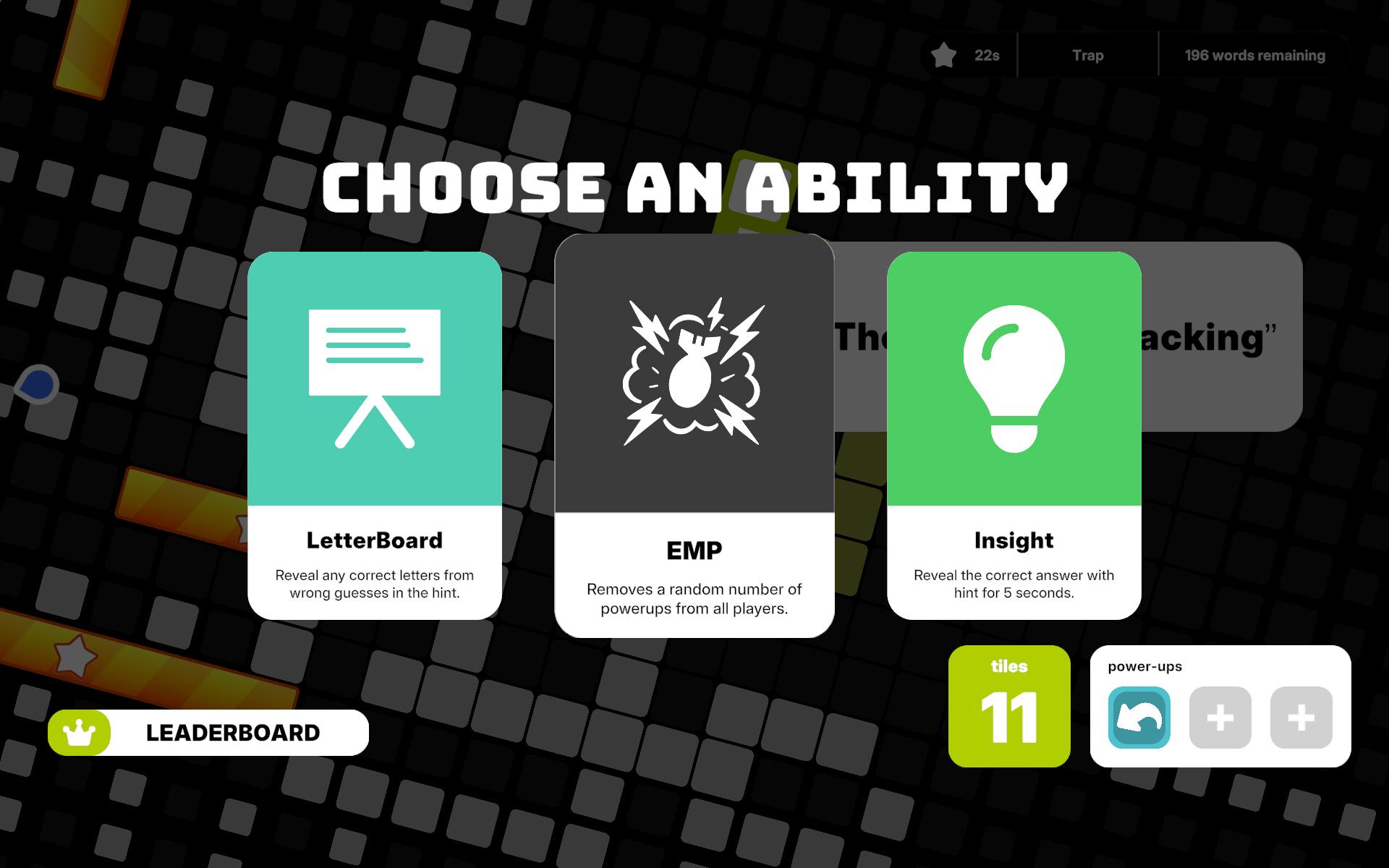 Aim to solve the most words before anyone else, Use power-ups to gain leverage and Out-maneuver your Foes to become the last man standing in the board!